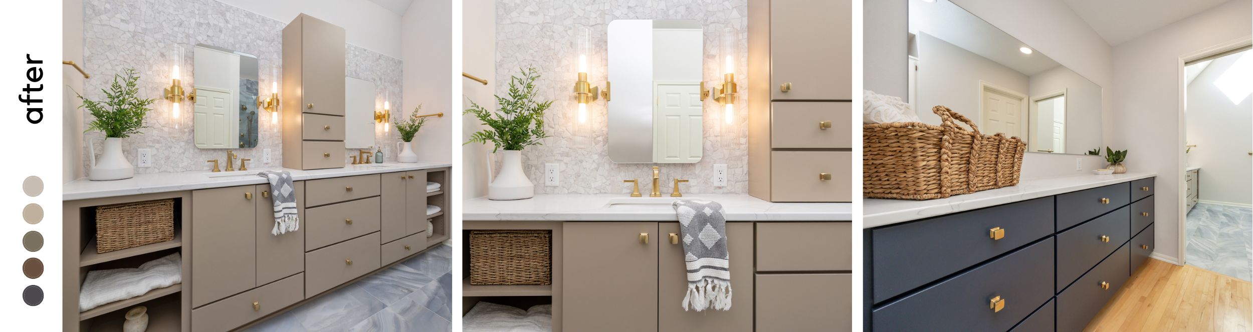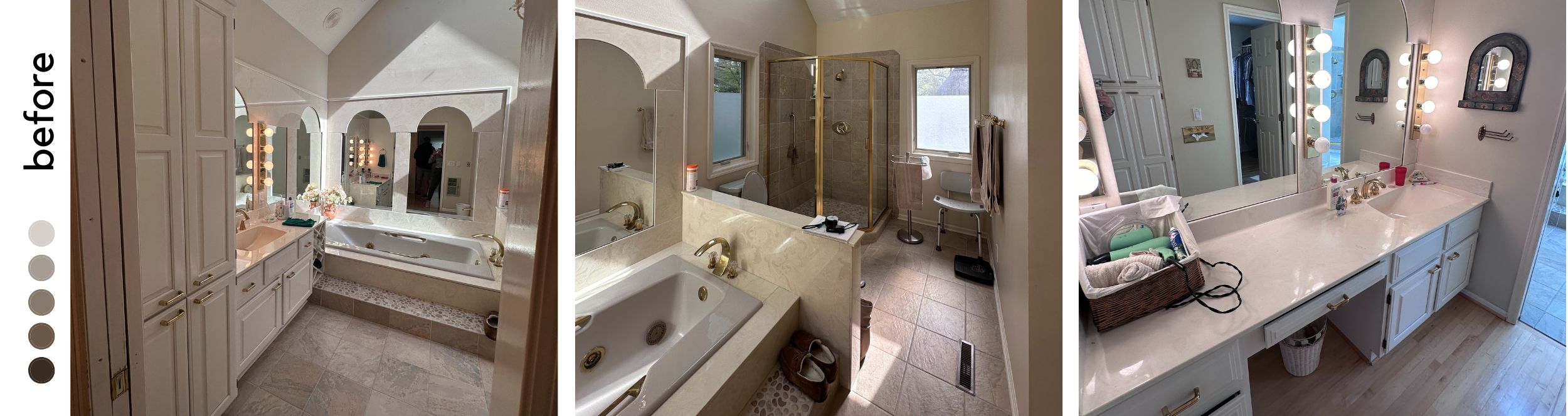 Following the remodel, the primary bath has a sense of calm sophistication. With the large tub gone, the homeowners can enjoy an expansive double vanity with a deliberate configuration of doors, drawers and open storage. Drawers are generally considered more efficient and accessible for bathroom storage. The luminous feature wall tile makes the entire vanity area feel brighter and more open, contrasting sharply with the heavier, all-beige tones of the "before" look.