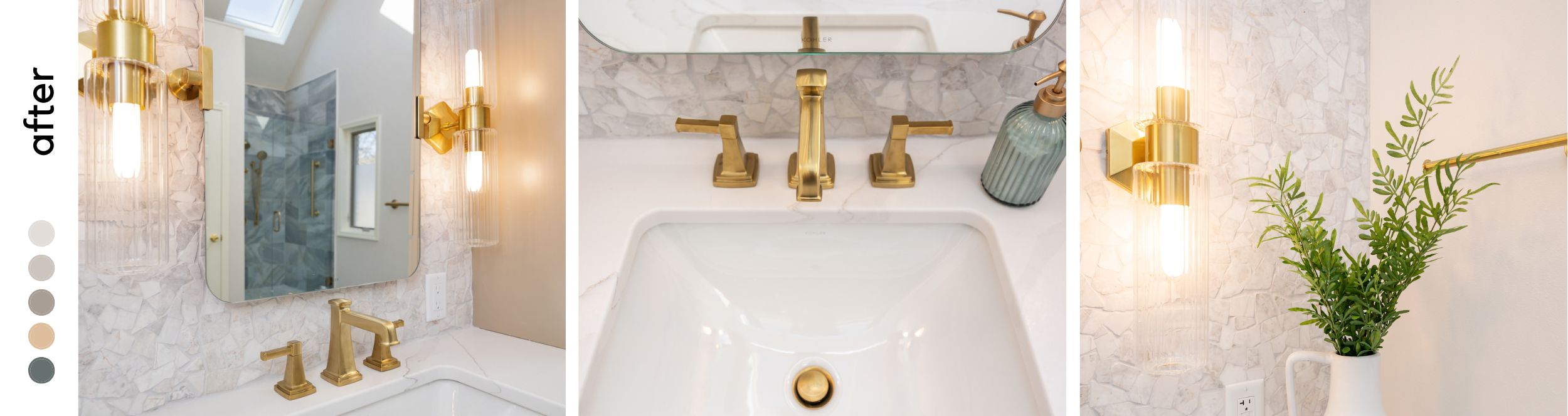 Rich gold tones have made their way into mainstream finishes and we're fully here for it. Softly opulent, gold tones warm spaces in a way that other finishes cannot. Our homeowners incorporated gold with lighting, plumbing fixtures and hardware throughout the space.